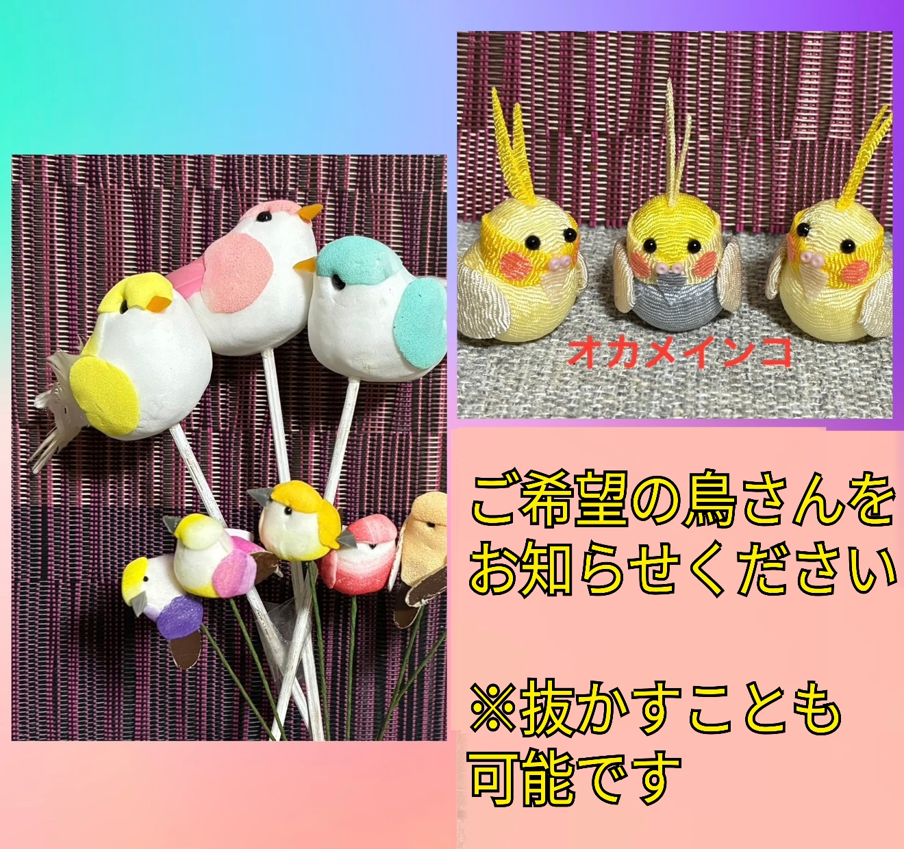 3、ご希望の鳥さんをお知らせください※在庫によりご希望に添えかねる場合がございます。鳥さんを抜くこともできます